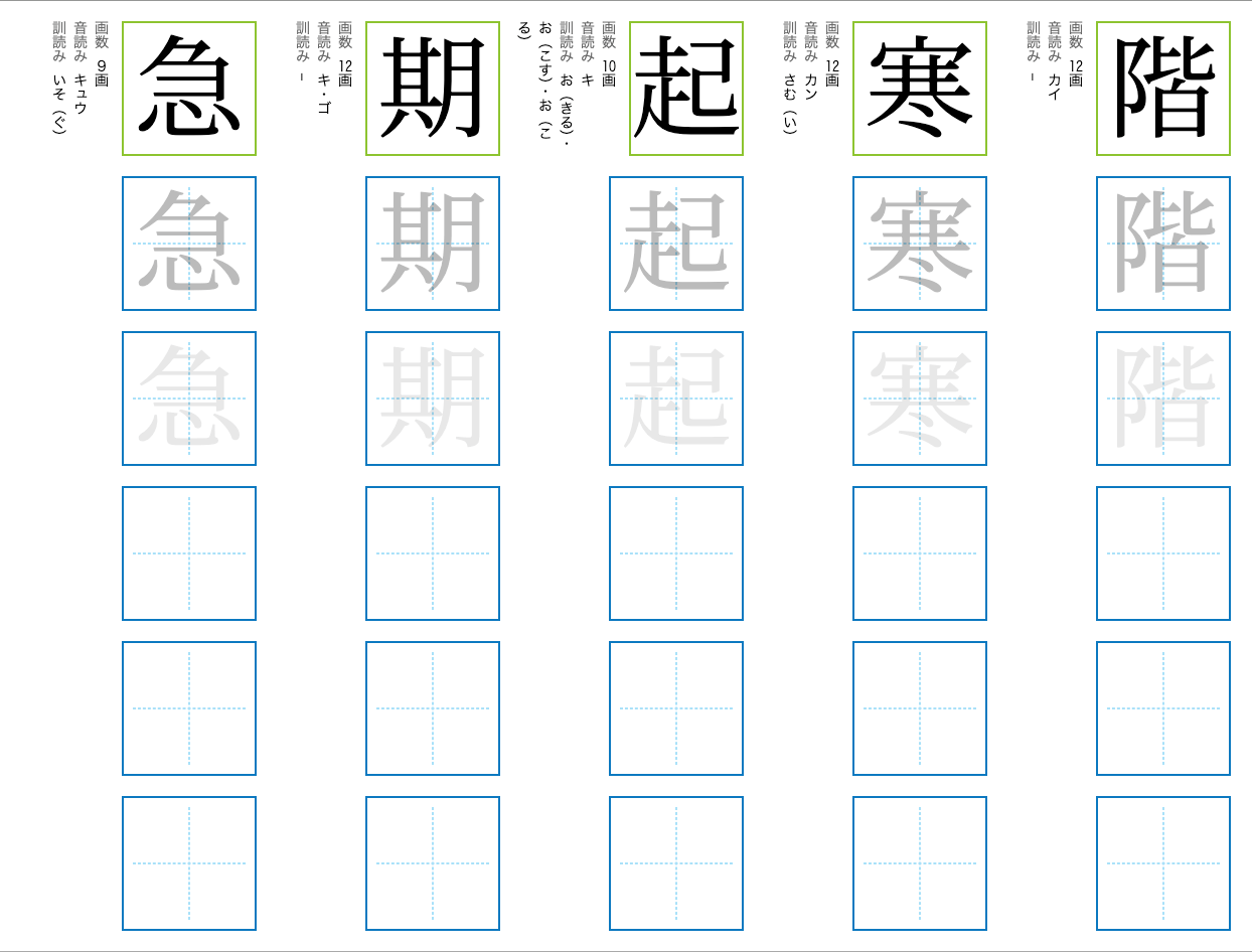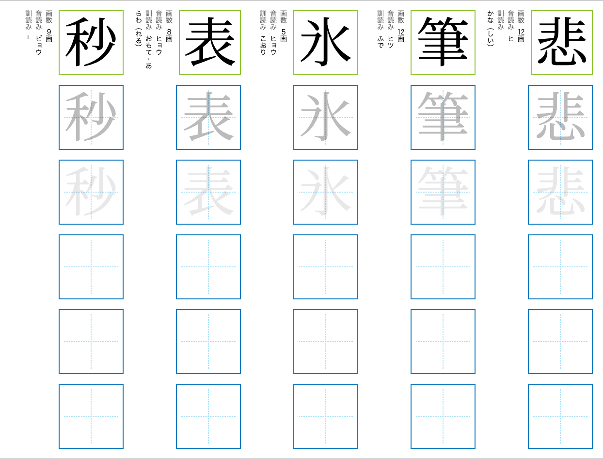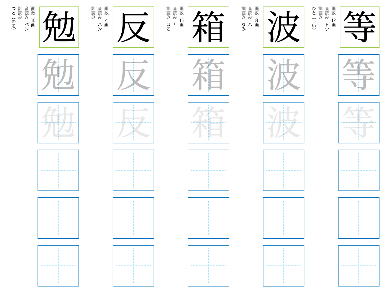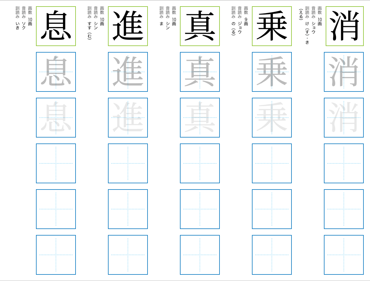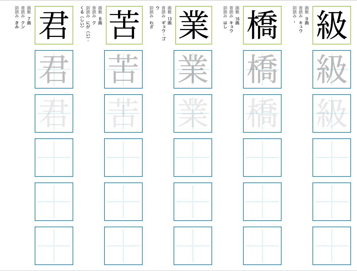 1学期から3学期まで順を追って練習していく際に、特定の漢字を選んで学習プリントを印刷することができます。