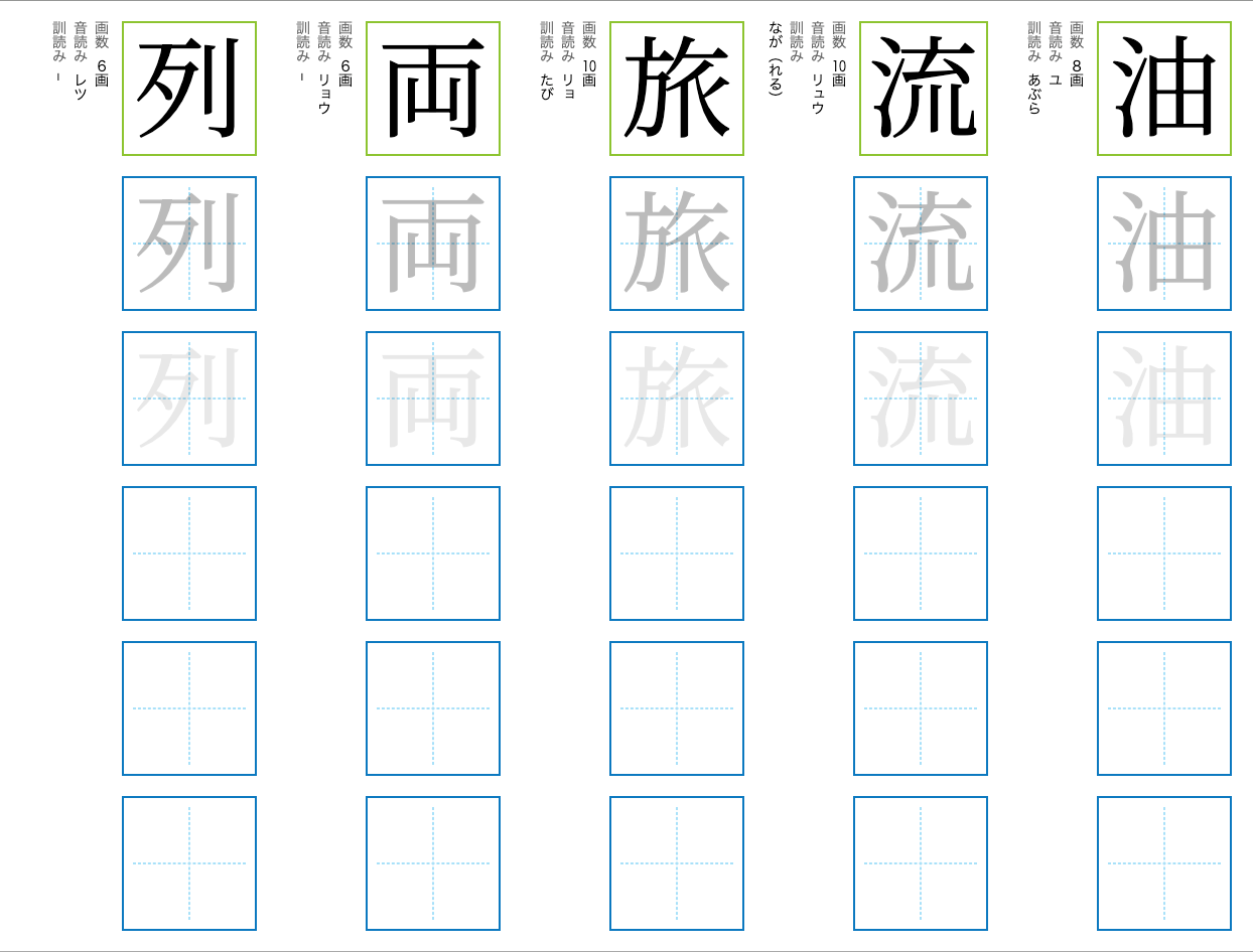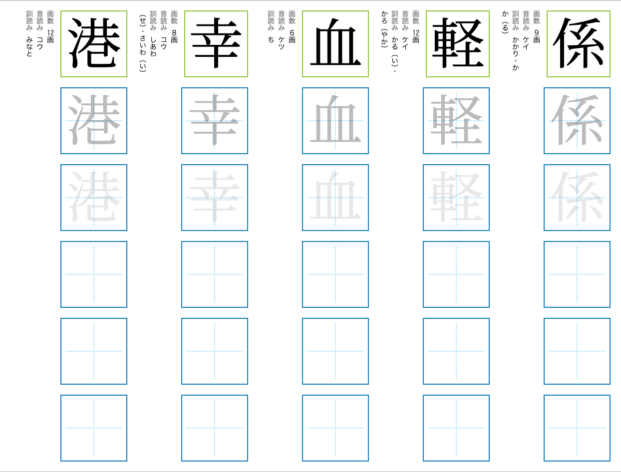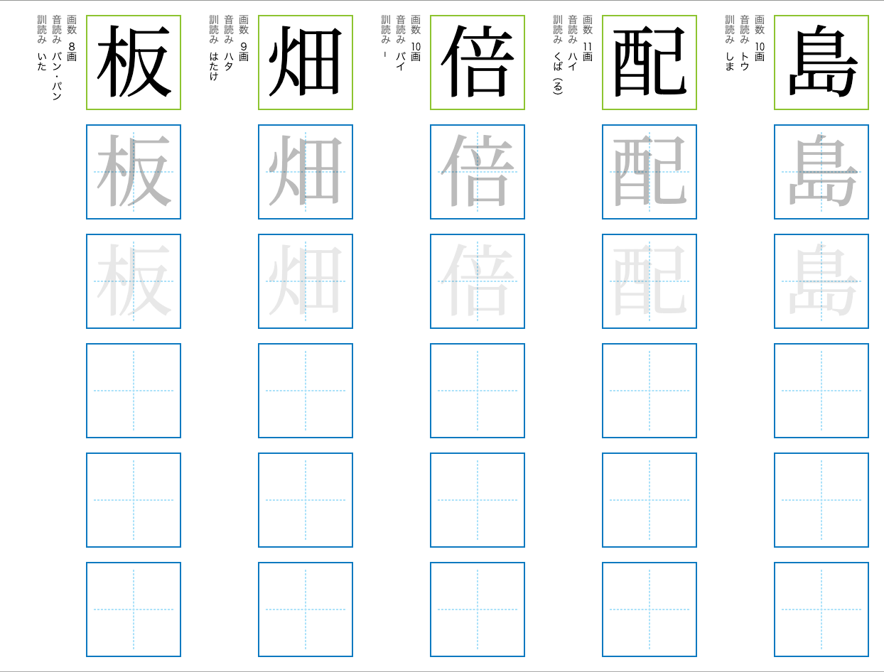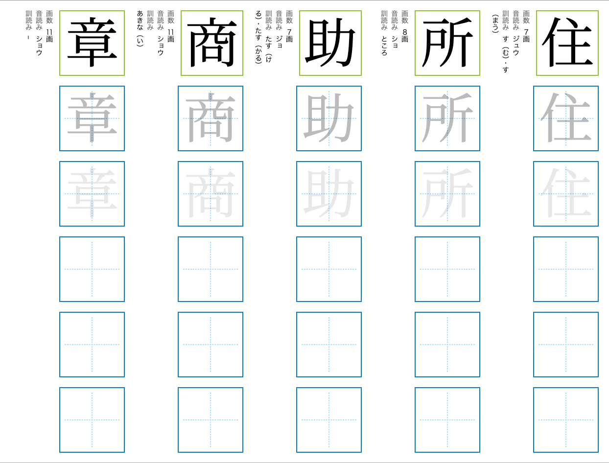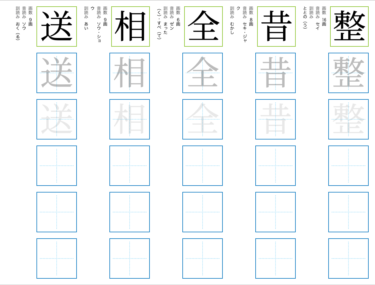 1学期から3学期まで順を追って練習していく際に、特定の漢字を選んで学習プリントを印刷することができます。