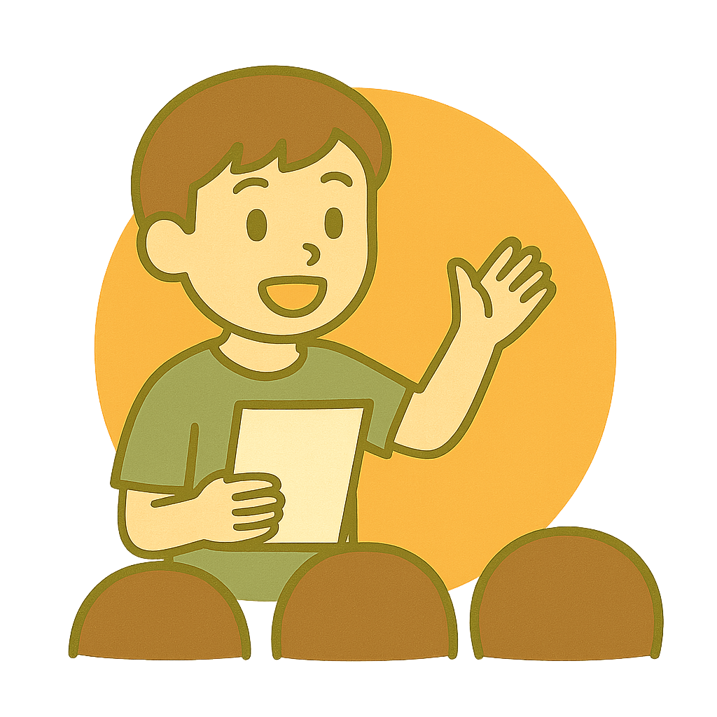 かんがえをみんなの前で発表(はっぴょう)する。