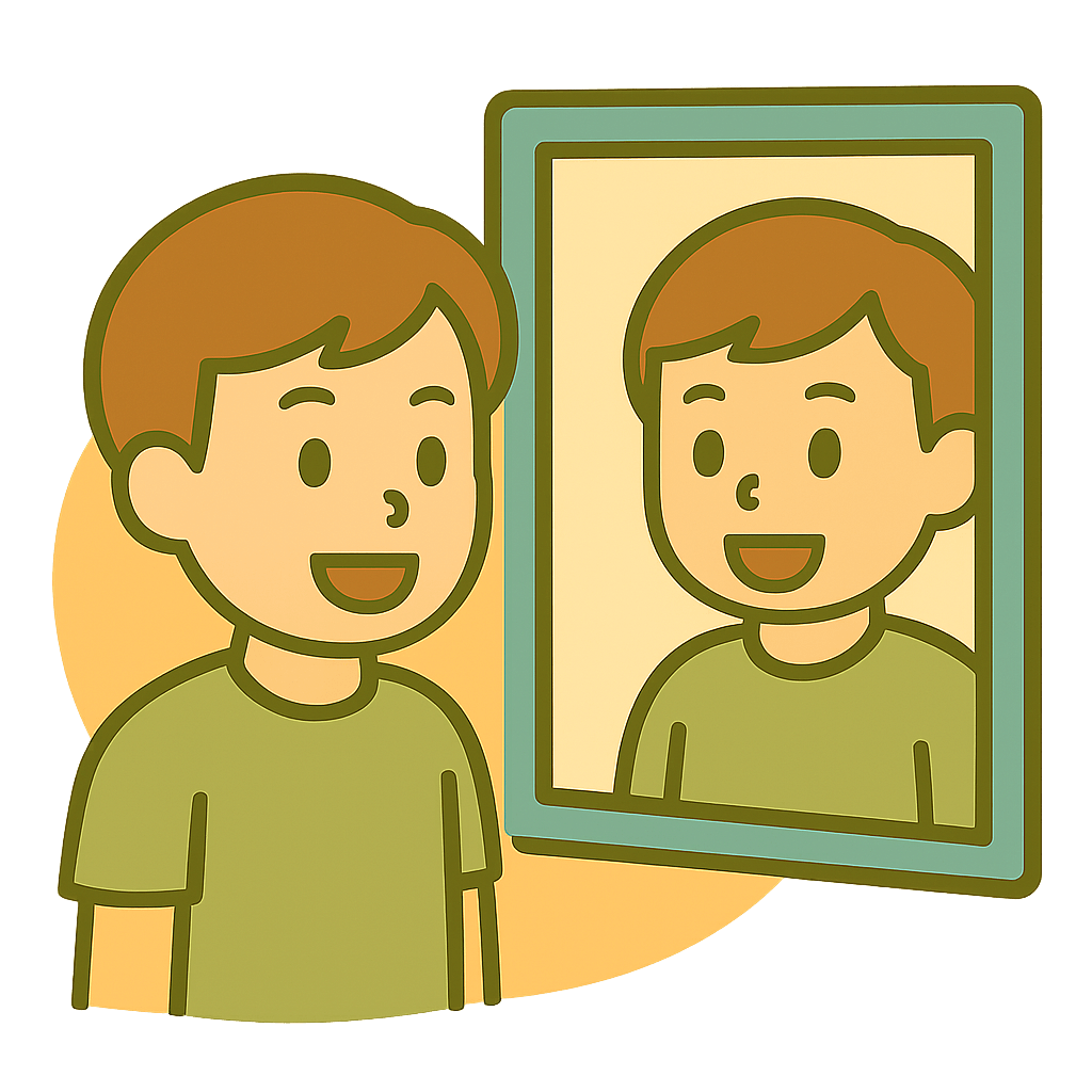 かがみにかおが写って(うつって)いる。