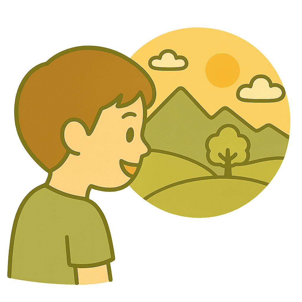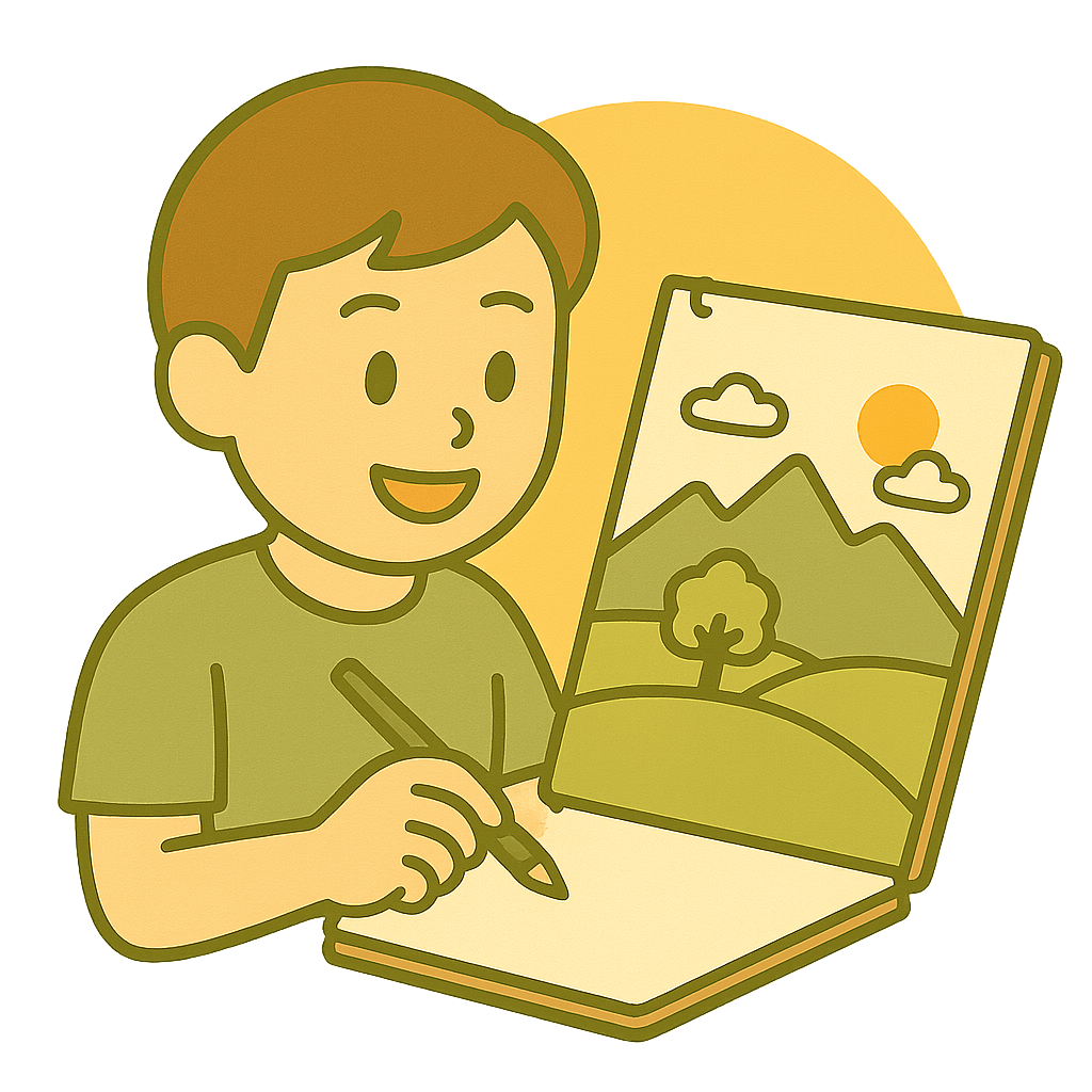 スケッチブックに山のけしきを写す(うつす)。