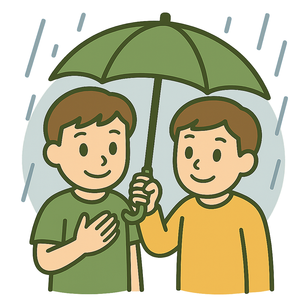 友だちがかさをかしてくれて助かった(たすかった)。