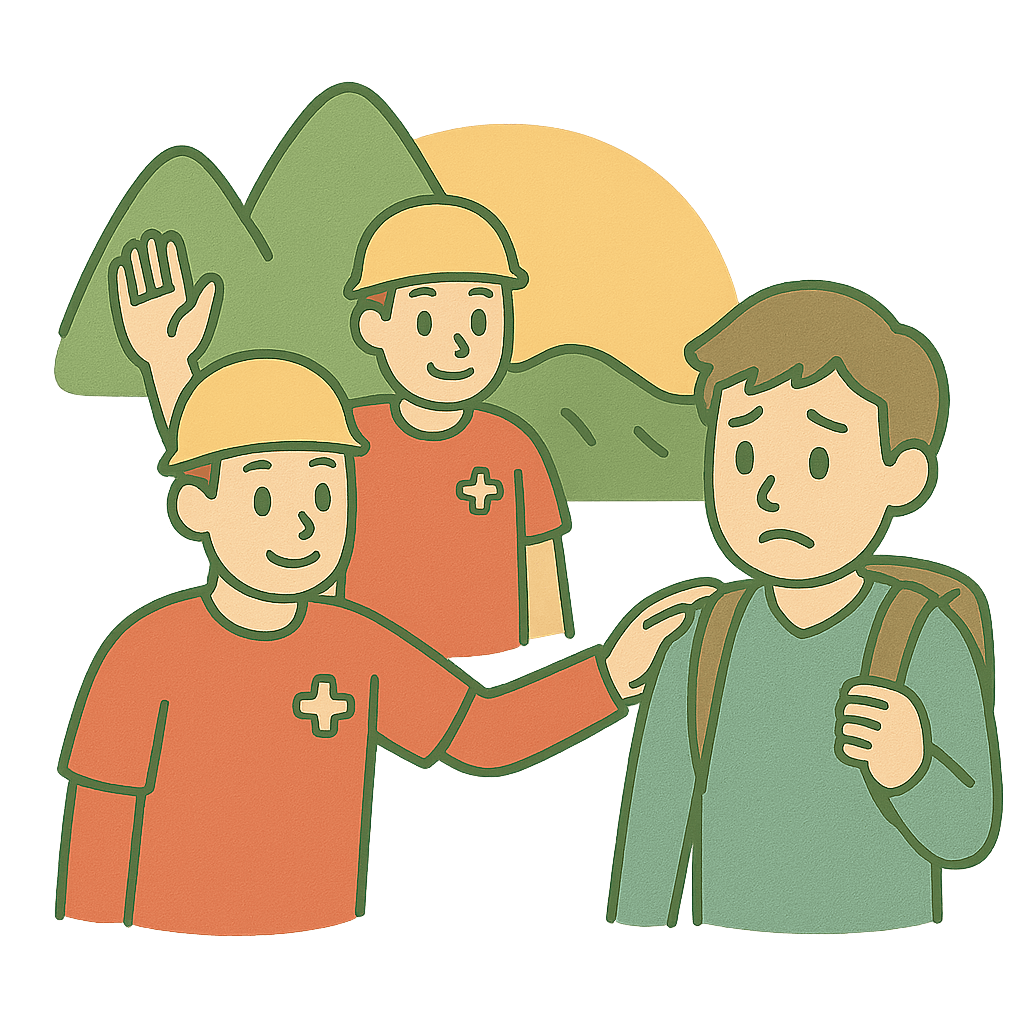 きゅう助(きゅうじょ)のチームが、山でまよった人を見つけてたすけた。