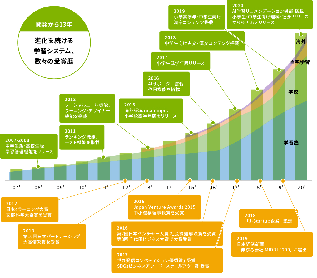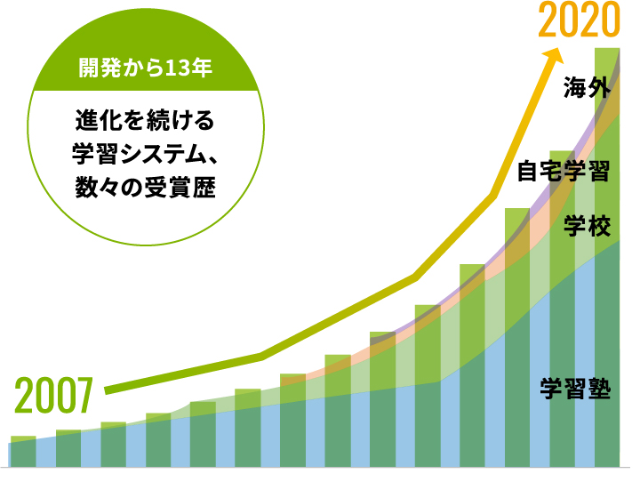 レクチャー機能、ドリル機能、テスト機能により、一人一人の習熟度に応じて理解→定着→活用のサイクルを繰り返し、学習内容の定着をワンストップで実現できます。初めて学習する分野でも一人で学習を進めることができる特長を生かし、小・中・高校、学習塾をはじめ、家庭学習、海外、放課後等デイサービス等においても活用が広がっています。