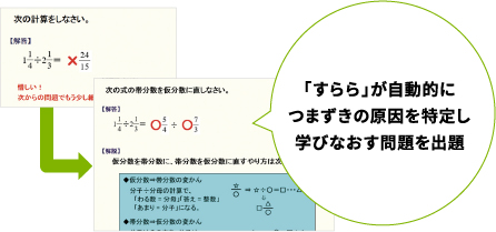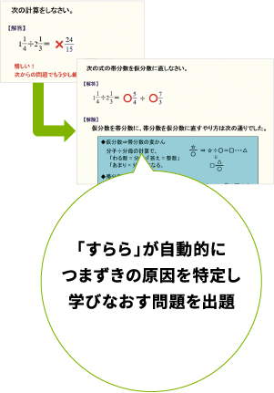 学校の授業が分からない場合、そのつまずきの原因は既に習った範囲のどこかの理解が不足している可能性があります。すららは「解けない原因」を自動的に診断し「今必要な問題」を出題するため、つまずきを確実に克服しながら次の単元に進めることができます。