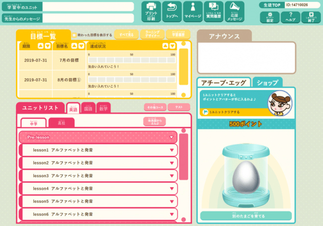 同時に、学習者に対するモチベーティング機能をさらに強化し、生徒が学習を進め、達成した場合にポイントを獲得できる「アチーブ・エッグ」というゲーミフィケーション要素を連動させます。