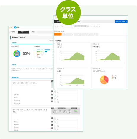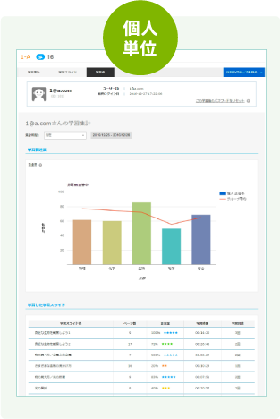 先生用管理Webサイト「douga pocket manager」を使って、生徒一人ひとりの学習履歴を管理することが可能です。学習した時間や回数、確認問題の回答状況まで、きめ細やかに生徒の状況を把握することができます。また、学習履歴は、生徒個人だけでなく、クラスなどのグループ単位でも管理することができます。